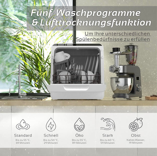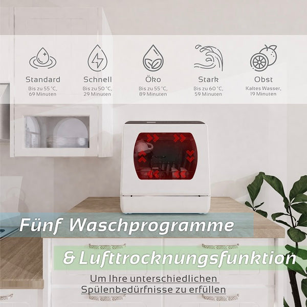 Hermitlux countertop dishwasher provides 5 washing modes. Each mode comes with a drying program (except fruit mode). In general, you don't need to select an additional drying program. The washing time and temperature are different for each program, you can choose the appropriate program according to your needs. Here is a picture to tell you the details of the 5 washing programs.